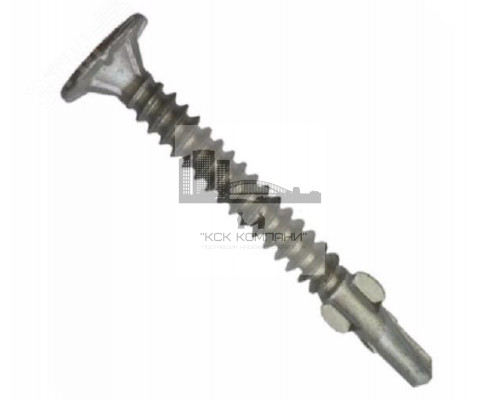Шуруп (саморез) стальной со сверлом и со специальной потайной головкой с насечками. Наличие крыльев на сверле обеспечивает формирование канала в ЦСП. Они выполняют следующие функции – сначала сверлят отверстие в дереве и обеспечивают свободное движения в нем шурупа, а затем при проникновении в металл отламываются. На нижней части головки метиза имеются режущие ребра, с их помощью он зенкует отверстие под головку. Толщина скрепляемых материалов до 15 мм.
