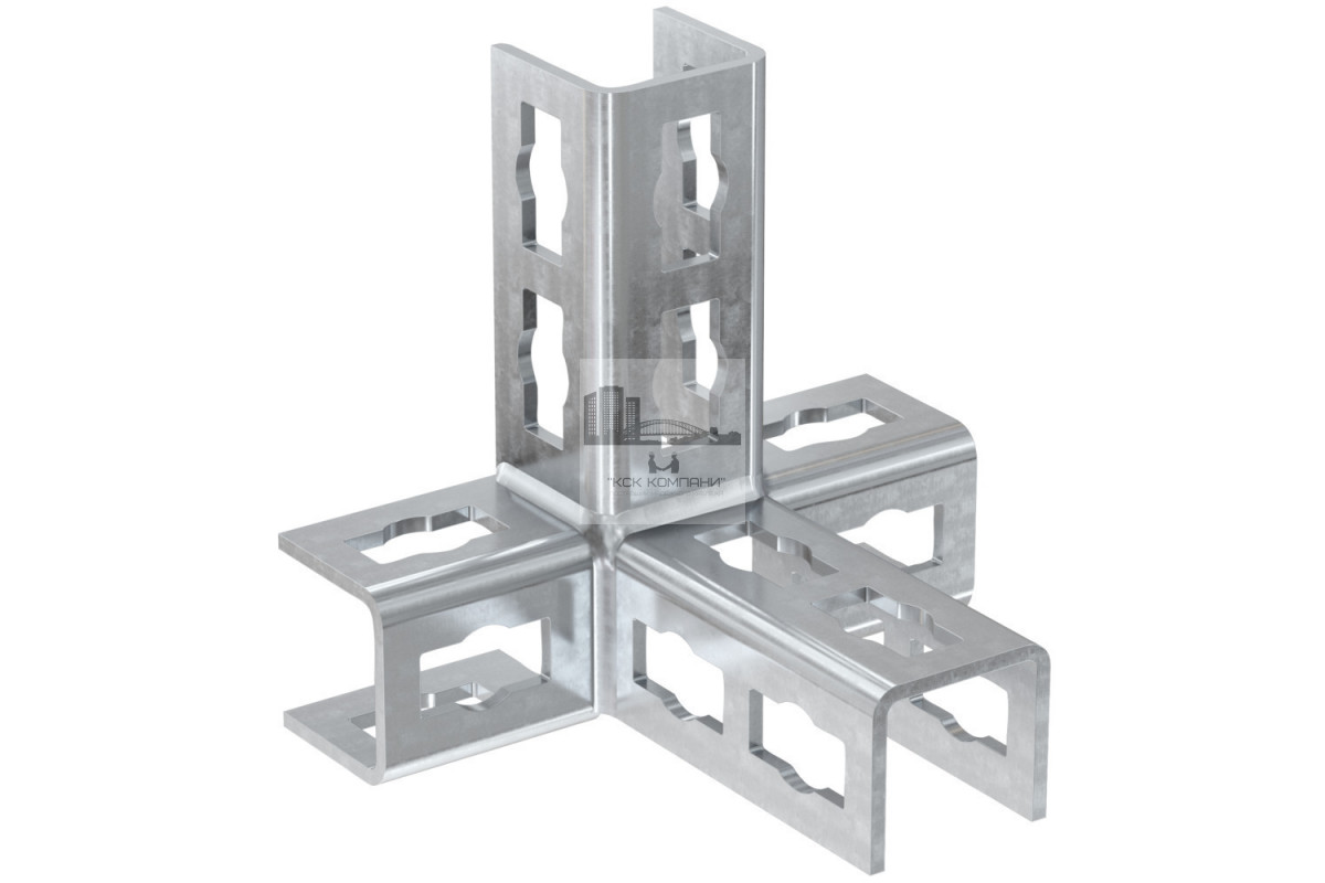 Описание и особенности: Уголок изготавливают из листовой горячеоцинкованной стали, толщина материала составляет 4 мм. Этот параметр обеспечивает уголкам рост несущей способности и прочности. Уголок представляет собой отрезки П-образного монтажного профиля, ширина которого равна 42 мм. Три элемента сварены горизонтально между собой в виде буквы “Т”, а четвертый – приварен к ним вертикально. Полная высота изделия 149 мм при ширине 172 и глубине 153. Во всех трех плоскостях всех составляющих элементов уголка вырезано по два окна сложной формы, предназначенных для крепления профилей с помощью болтов в комплекте с канальными гайками PFCN. |