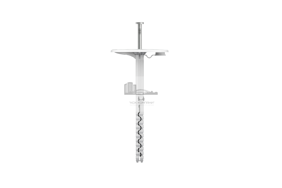 Полимерный тарельчатый дюбель c забивным распорным стальным элементом и термозаглушкой.