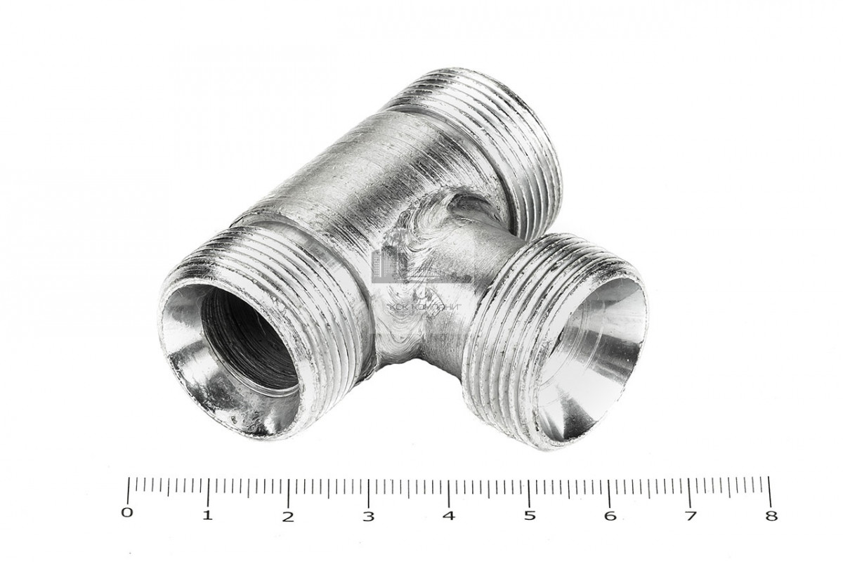 Тройник проходной с наружной резьбой для соединения рукавов высокого давления между собой, а также для присоединения РВД к насосам, гидроцилиндрам, гидроусилителям по внутреннему конусу. Предназначены для разделения непрерывного рабочего потока на несколько разнонаправленных ветвей.