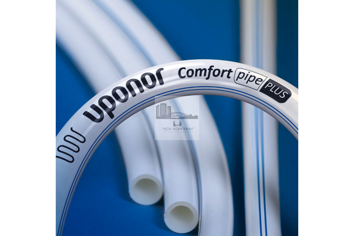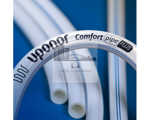 Труба изготавливается из сшитого полиэтилена PE-Xa, в соответствии с EN ISO 15875 и ГОСТ Р 52134, серия S5,0. Имеет антидиффузионный слой от проникновения кислорода EVOH (сополимер этилена и винилового спирта) для предотвращения коррозии элементов системы и соответствует требованиям DIN 4726 по кислородопроницаемости. Трубы Uponor Comfort Pipe Plus предназначены для систем радиаторного и напольного отопления и охлаждения, полностью совместимы с фитингами Uponor Q&E и зажимными адаптерами. Они также имеют дополнительный внешний слой из полиэтилена PE белого цвета с двумя синими полосами, защищающий их от механических повреждений.