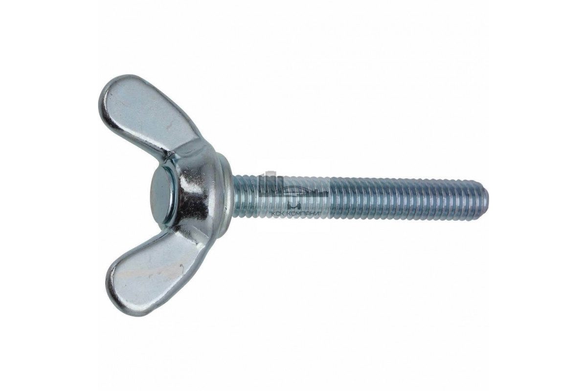 Особенности: Крепеж представляет собой стержень с наружной резьбой и головкой с двумя выступами в виде барашков (округлыми лепестками). Форма головки позволяет закручивать и откручивать винт вручную без инструмента. Изделие обладает стандартным классом прочности 4.8-5.8, изготавливается из оцинкованной стали, применяется в узлах с небольшой нагрузкой. |
