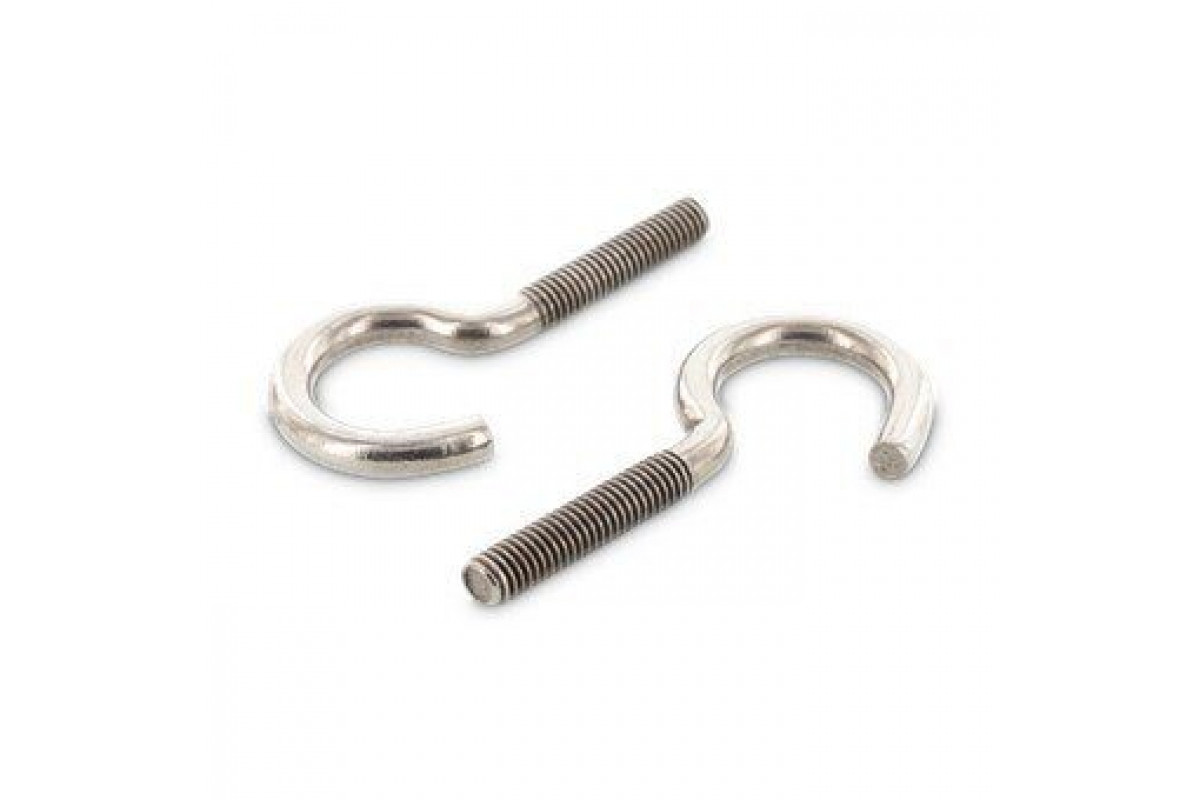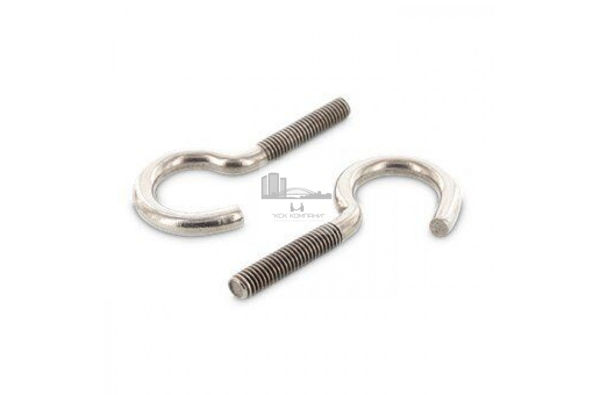 | Применение: Винт-полукольцо имеет стержень с полной резьбой и вместо шляпки у него крюк. Винт Art. 9081 дает возможность быстро снимать и вешать устанавливаемую конструкцию, но для колеблющихся предметов безопаснее применять винт - кольцо. Монтаж винта происходит вручную путем вкручивания шляпки полукольца, для более надежной фиксации можно взять отвертку или какой - нибудь металлический стержень. С разомкнутого элемента трос или веревка может соскользнуть. |