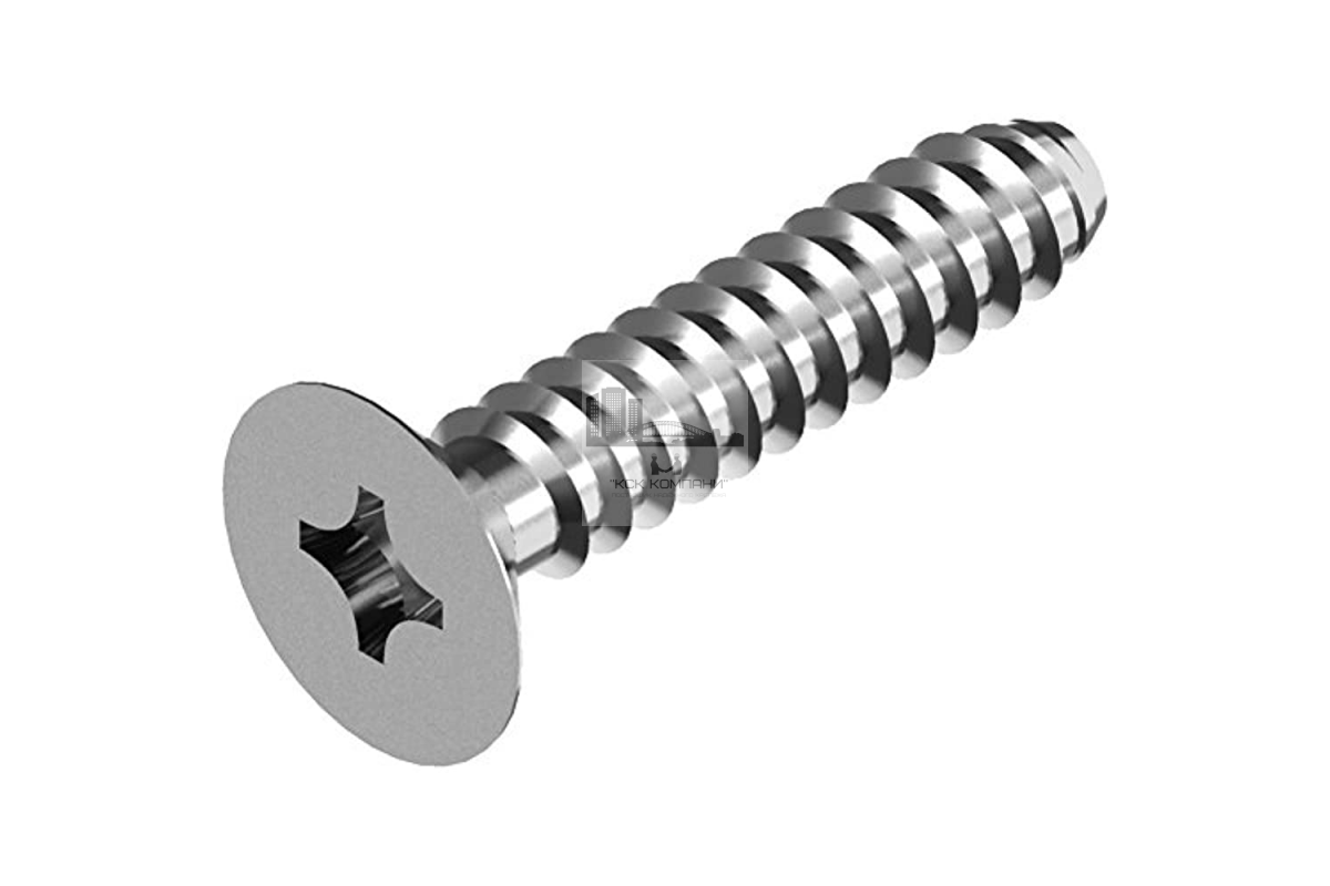 Саморез с потайной головкой из нержавеющей стали реализуется с тупым концом, имеет исполнение с крестообразным шлицем и применяется по дереву и металлу.