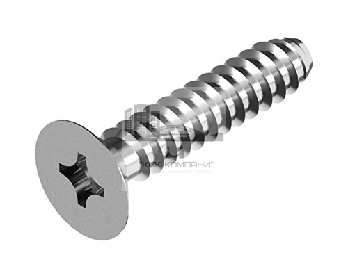 Саморез с потайной головкой из нержавеющей стали реализуется с тупым концом, имеет исполнение с крестообразным шлицем и применяется по дереву и металлу.