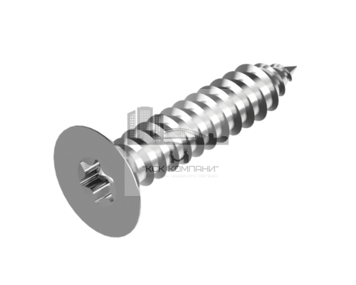 Саморез DIN 7982 из нержавеющей стали реализуется с острым концом, имеет звездообразный шлиц Torx и применяется по дереву, пластику и металлу.