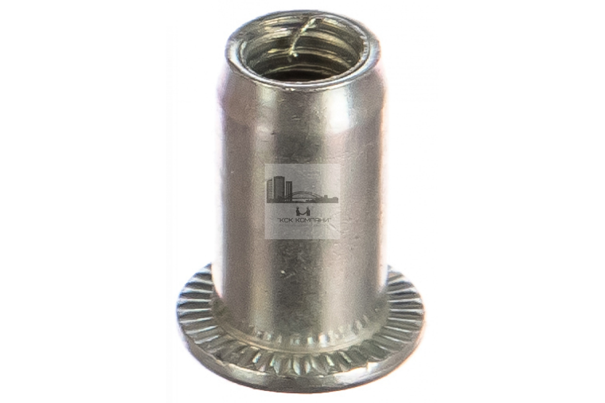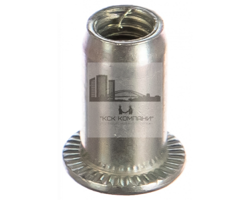 Заклепка гайка с цилиндрическим бортиком выполнена из стали с цинковым покрытием, что обеспечивает стойкость к коррозии и ржавчине. Монтаж гайки выполняется гидравлическим или ручным ключом, для установки требуется заранее подготовить гнездо. Размеры гайки заклепки с резьбой варьируются от М3 до М12, имеют стандартный шаг.