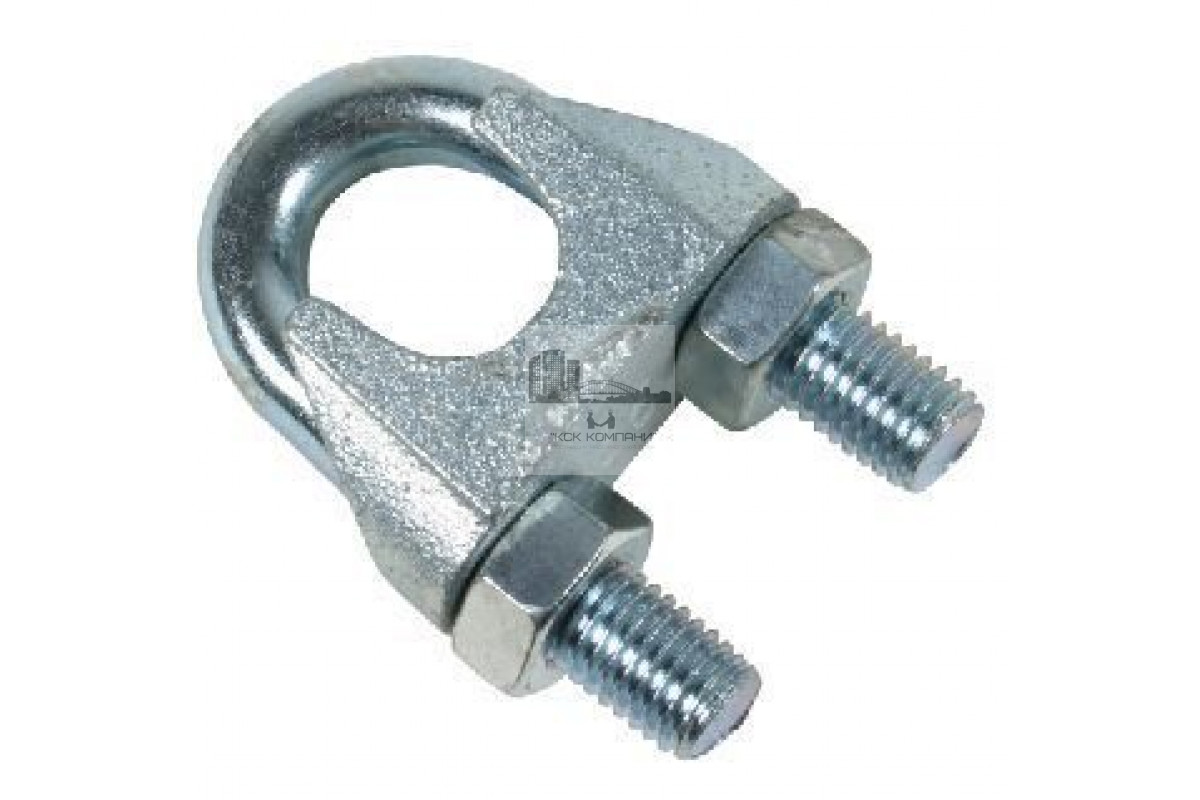 Особенности: Крепеж из оцинкованной стали, состоит из дугообразной скобы, имеющей на концах резьбу. Резьбовые концы помещенные в отверстия литой колодки, на них накручены шестигранные гайки. Конструктивно между основанием и скобой образовывается овальное кольцо, в него помещают концы каната. |