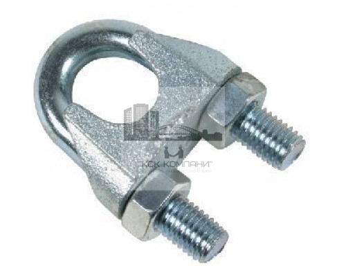 Особенности: Крепеж из оцинкованной стали, состоит из дугообразной скобы, имеющей на концах резьбу. Резьбовые концы помещенные в отверстия литой колодки, на них накручены шестигранные гайки. Конструктивно между основанием и скобой образовывается овальное кольцо, в него помещают концы каната. |
